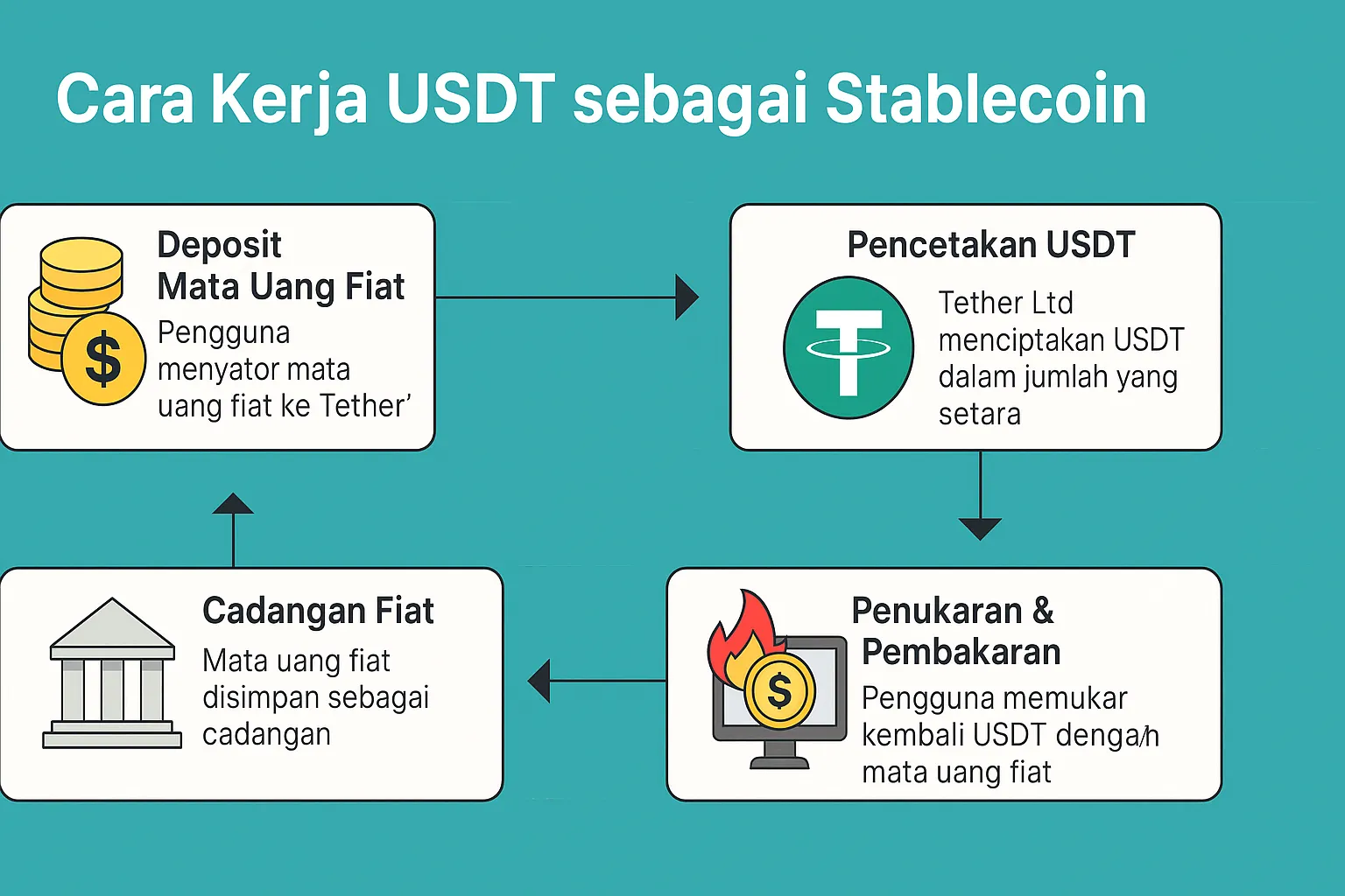 USDT bekerja dengan cara mempertahankan cadangan dolar di rekening bank perusahaan penerbit. Setiap 1 USDT yang beredar, seharusnya didukung oleh 1 USD atau aset setara yang dimiliki penerbit.